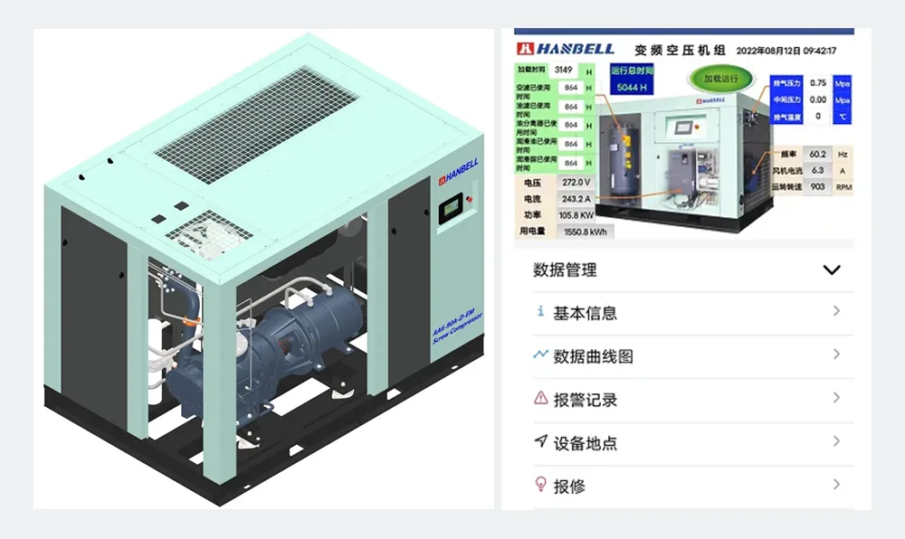 The Two stage Compression Variable Frequency Screw Air Compressor of Hanbell are all equipped with a cloud service system. Through the Internet of Things technology, it realizes functions such as remote monitoring, remote after-sales service, fault alarm and equipment location tracking. Through a large amount of data analysis, it provides objective data basis for the improvement, maintenance and health status of the equipment.
